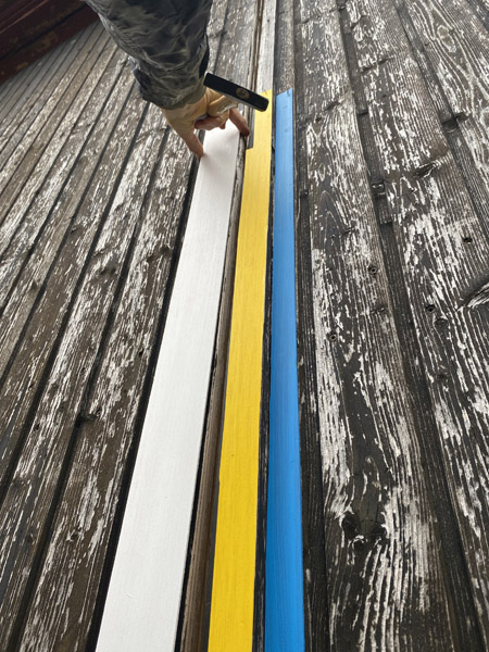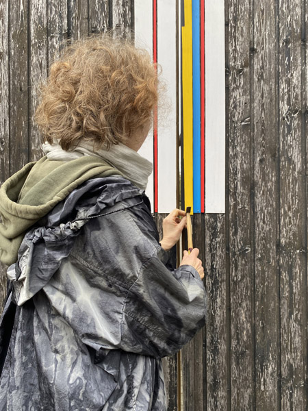 Streifen bilden ein zentrales Prinzip im Werk von Jutta Obenhuber. Sie erscheinen als wiederkehrende Struktur, die nicht nur auf der Bildfläche entsteht, sondern aus Material, Rhythmus und Wiederholung entwickelt wird. In den Scheunentorbildern greifen farbig bemalte Holzlatten die vorhandene Konstruktion der Tore auf und machen deren Gliederung sichtbar.